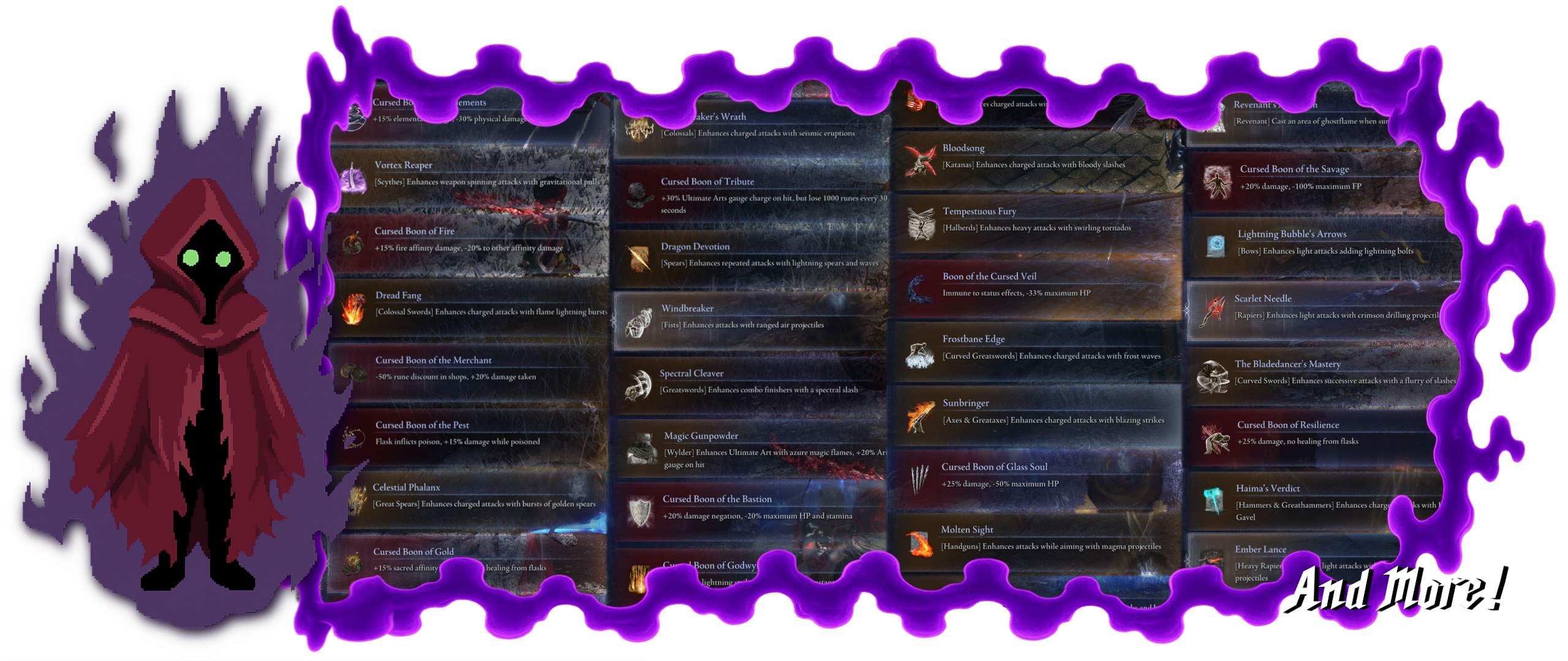 New Weapons: Curseblade Cirque, Great Katana, Backhand Blades, Light Greatsword, Cruel Oath, Two Dragons, Vagabond Sword, Wukong's Staff, Gunsliger Pistol, Messmer's Spear, Demon Staff, Cursemark of Death, Sparking Odachi, Renna's Rimesong and Blood Battle Arts (all with custom movesets)